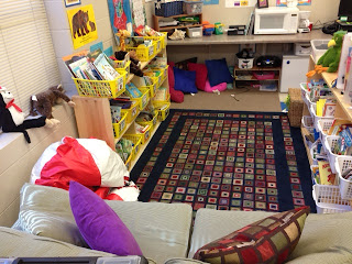 Area– My classroom library. The kids love to go in the library and get a book and cozy up on the couch. They also love to crawl under the counter and listen to a book on the pillows. My Dad built me the shelves and I am able to store a lot of books. Sometimes, I even curl up on the couch and take little rest while they are in gym or library 🙂