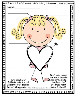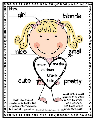 Now on to the freebie. This idea was given to me by a friend of mine that is working on her Master’s in Literacy and it is research based. It really gets the students thinking about the characters on a deeper level. I love doing it with Goldilocks because at the beginning of the lesson, the students always say she is the “good” character because of what she looks like. Then we do the inside/outside traits of her and they immediately change their minds. I let the kids take them home so I don’t have a kid’s example, but here are some of the words they came up with (all on their own 🙂