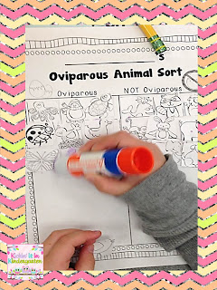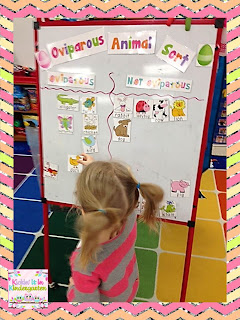 Then I let the kids come up and sort the animals by drawing their name out of “The Magic Bucket” (The Magic Bucket is where I write names on popsicle sticks and draw them out when we do activities like this) by oviparous or not oviparous and then we checked our answers.